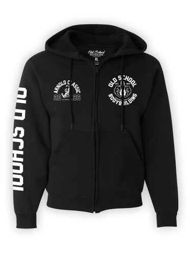 A super soft classic fit mid weight Zip Hoodie to commemorate the 2026 Arnold! Our "Emblem" left chest logo with Arnold 2026 on the right chest. OLD SCHOOL in bold block letters on the right sleeve.