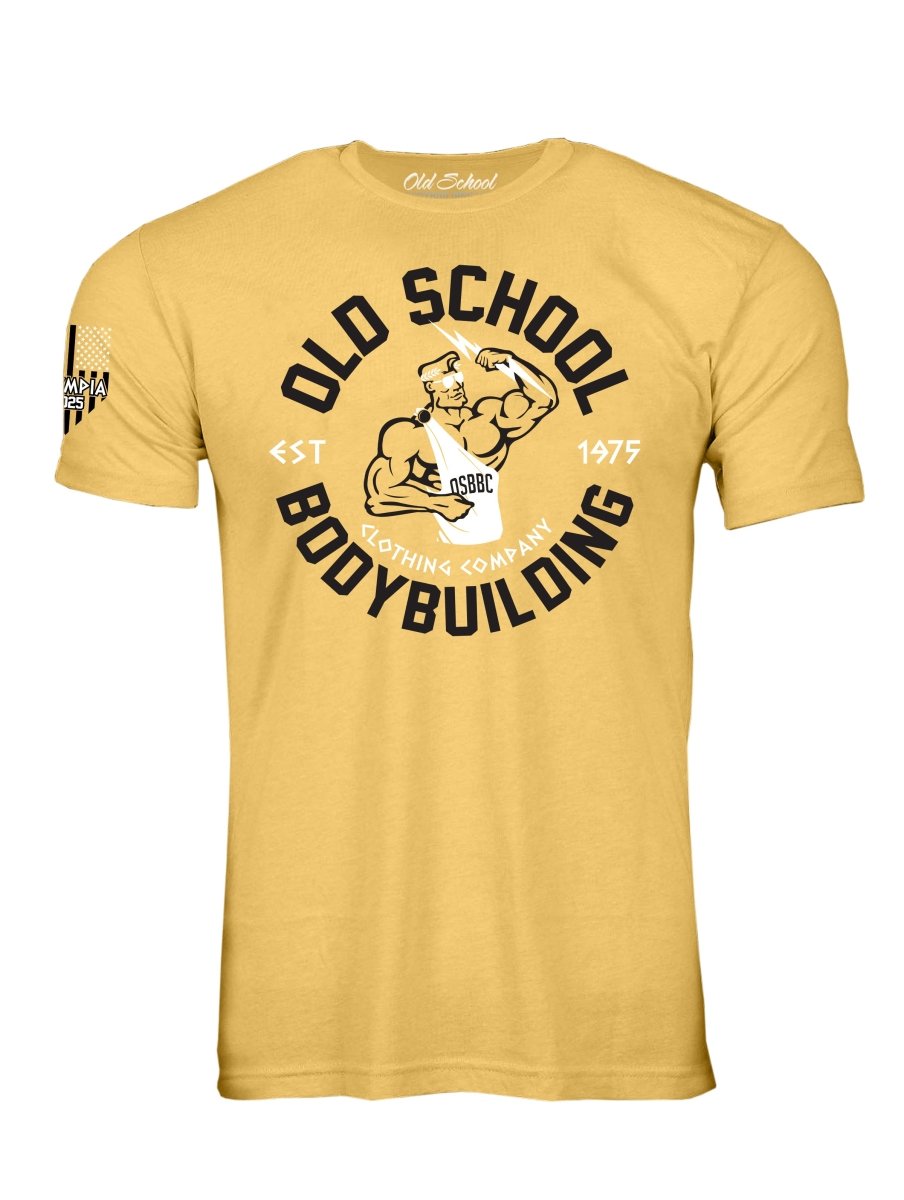 Our Commemorative "Olympia 2025" Black and White logo 60/40 Banana Cream tee shirt. We have our "Greek" inspired Emblem logo on the front with Bruno wearing a toga. The Olympia, Las Vegas logo is on the back. The right sleeve has a special commemorative "Olympia 2025" USA flag to finish it off.
