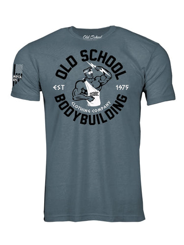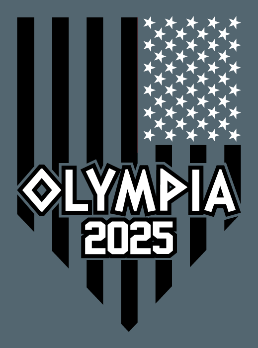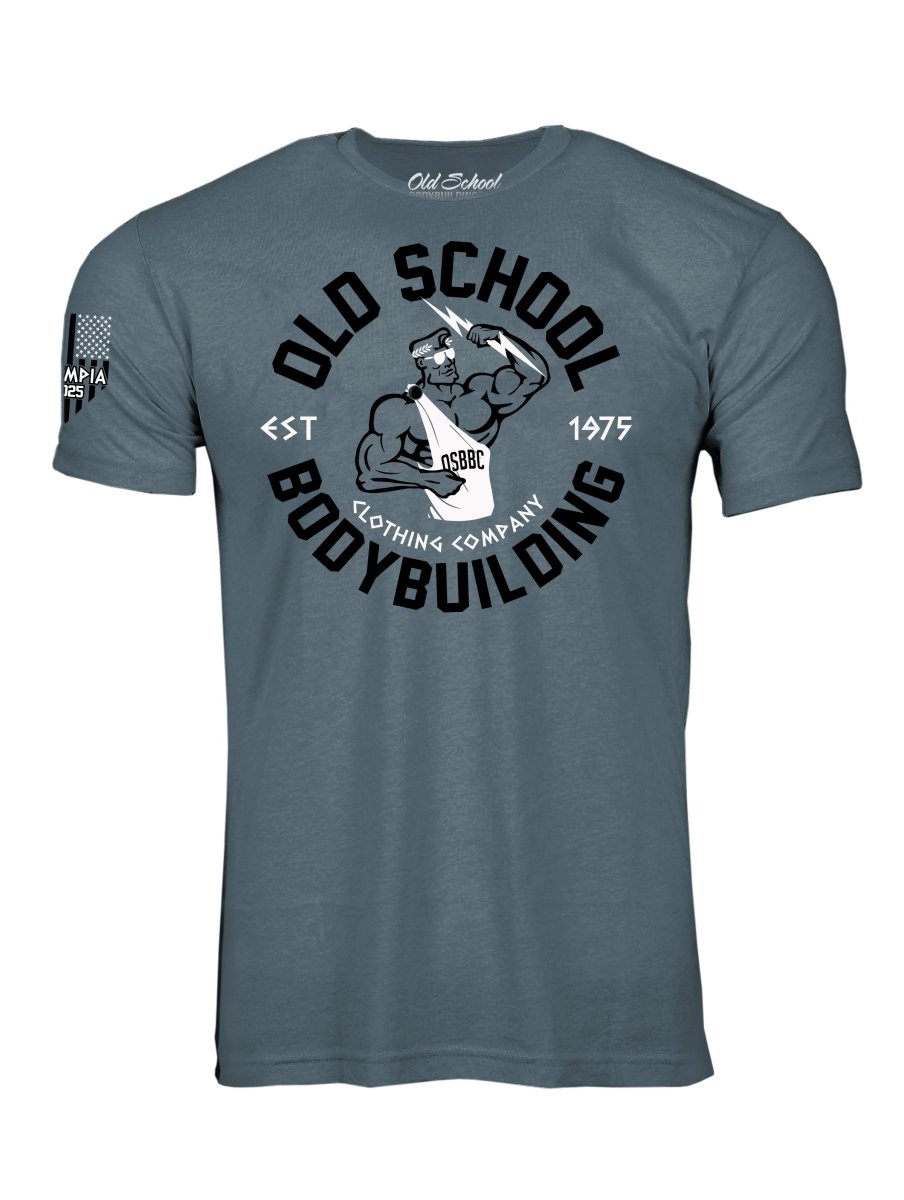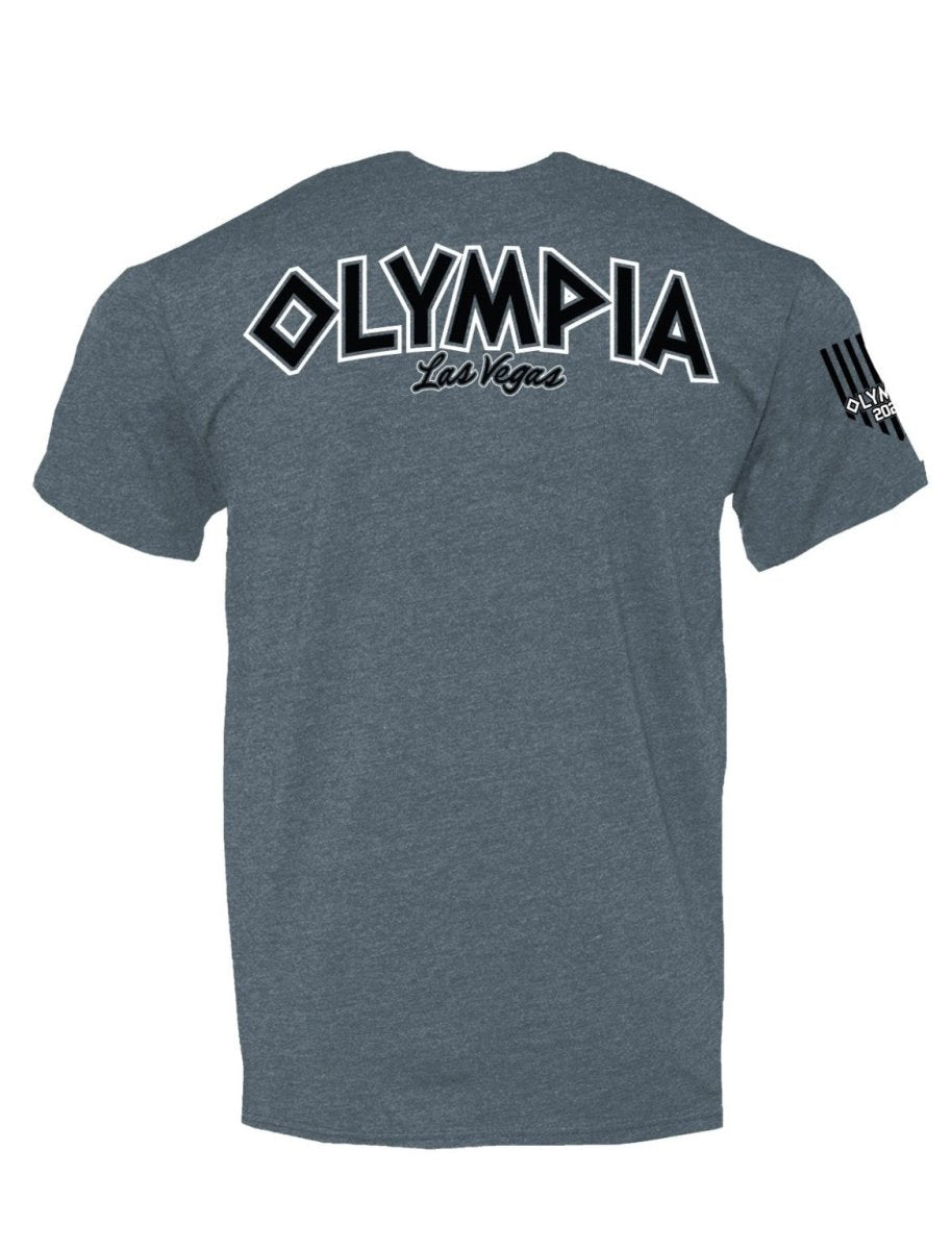 Our Commemorative "Olympia 2025" Black and White logo on our 60/40 Slate Blue tee shirt. We have our "Greek" inspired Emblem logo on the front with Bruno wearing a toga. The Olympia, Las Vegas logo is on the back. The right sleeve has a special commemorative "Olympia 2025" USA flag to finish it off.