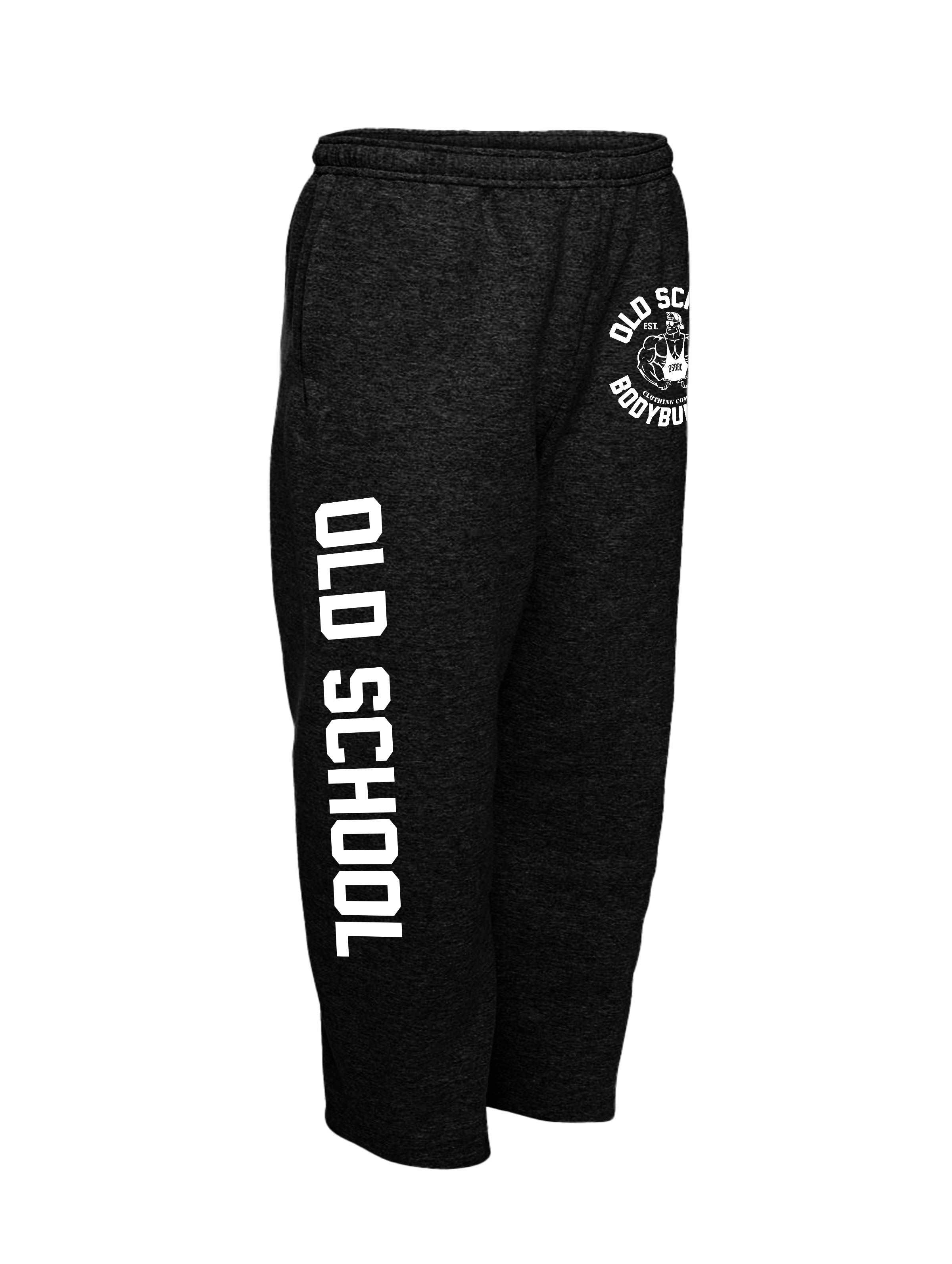 Unisex Black 50/50 sweat pants with Emblem in bright white by the left pocket and OLD SCHOOL in bright white on the side of the right pant leg. Deep pockets and the open bottom pant legs make these the perfect backstage cover up. Easy slip on slip off.